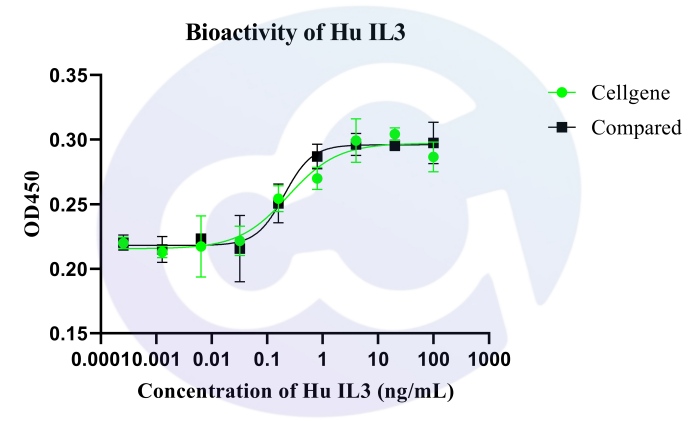 Based on four-parameter logistic (4PL) curve fitting analysis, the ED₅₀ of Cellgene’s protein was determined to be 0.238 ng/mL, while that of the competitor protein was 0.203 ng/mL, indicating comparable activity levels between the two.
