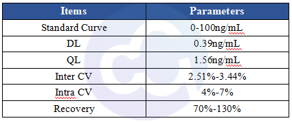 For Cellgene Bioscience's kit, the Detection Limit (DL) and Quantitation Limit (QL) are 0.39 ng/mL and 1.56 ng/mL, respectively (see Figure 3). The intra-batch and inter-batch Coefficient of Variation (CV) are controlled within 10%. The recovery rates under conditions containing Tris, Sodium Chloride, Urea, Isopropanol, Arginine, etc., are all within the range of 70%-130%, and most are within 80%-120%. These results demonstrate that the kit has significant advantages in sensitivity, precision, and recovery rate (see Tables 4 and 5).